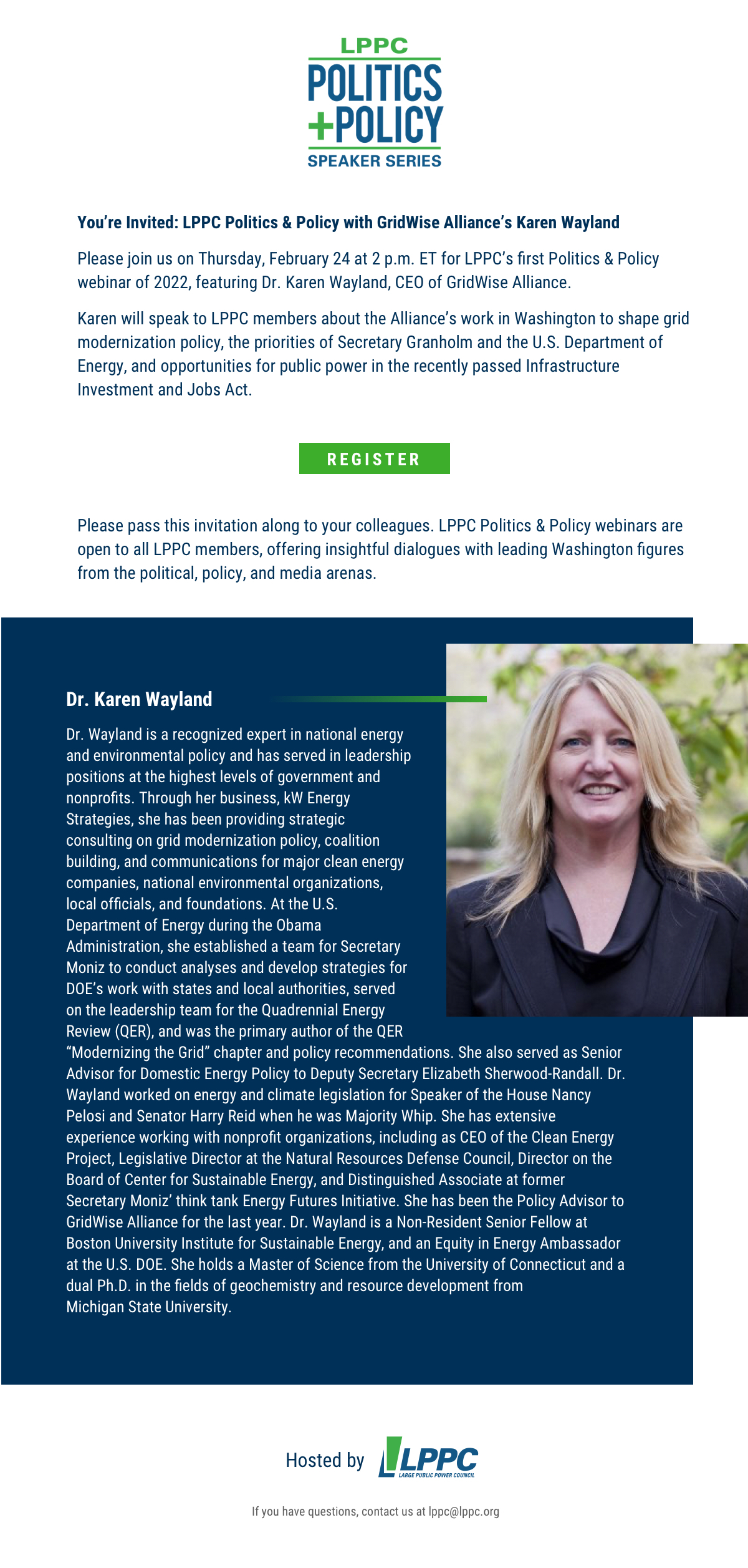 Register now for our next Politics & Policy webinar on February 24th with guest speaker Karen Wayland of GridWise Alliance.
